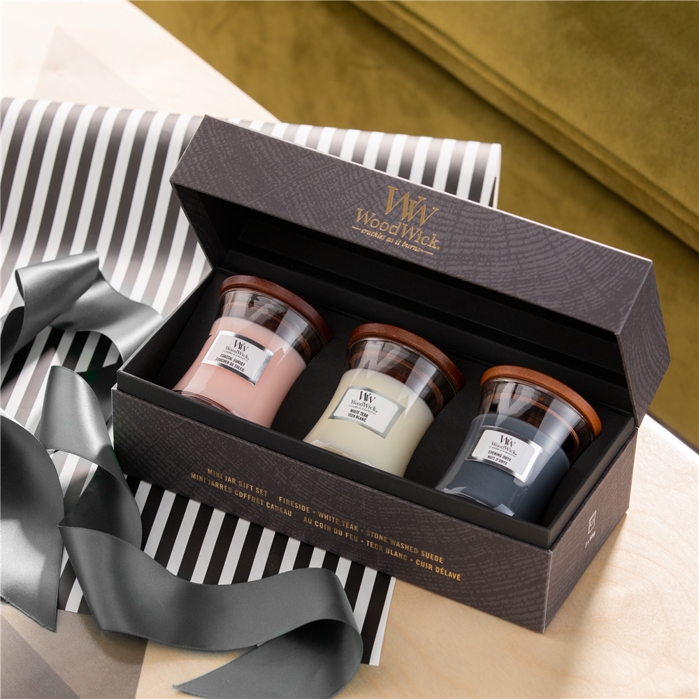 Coffret cadeau avec 3 minis jarres: 1x Nuit d’Onyx, 1x Ylang Ylang Solaire et 1x Coucher de Soleil